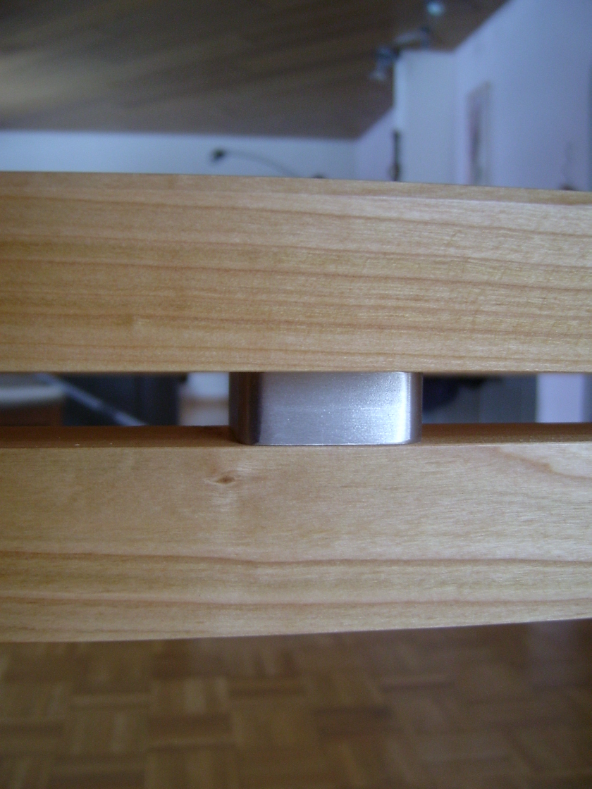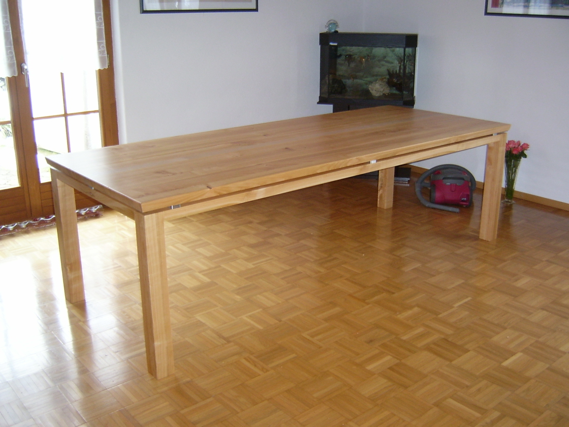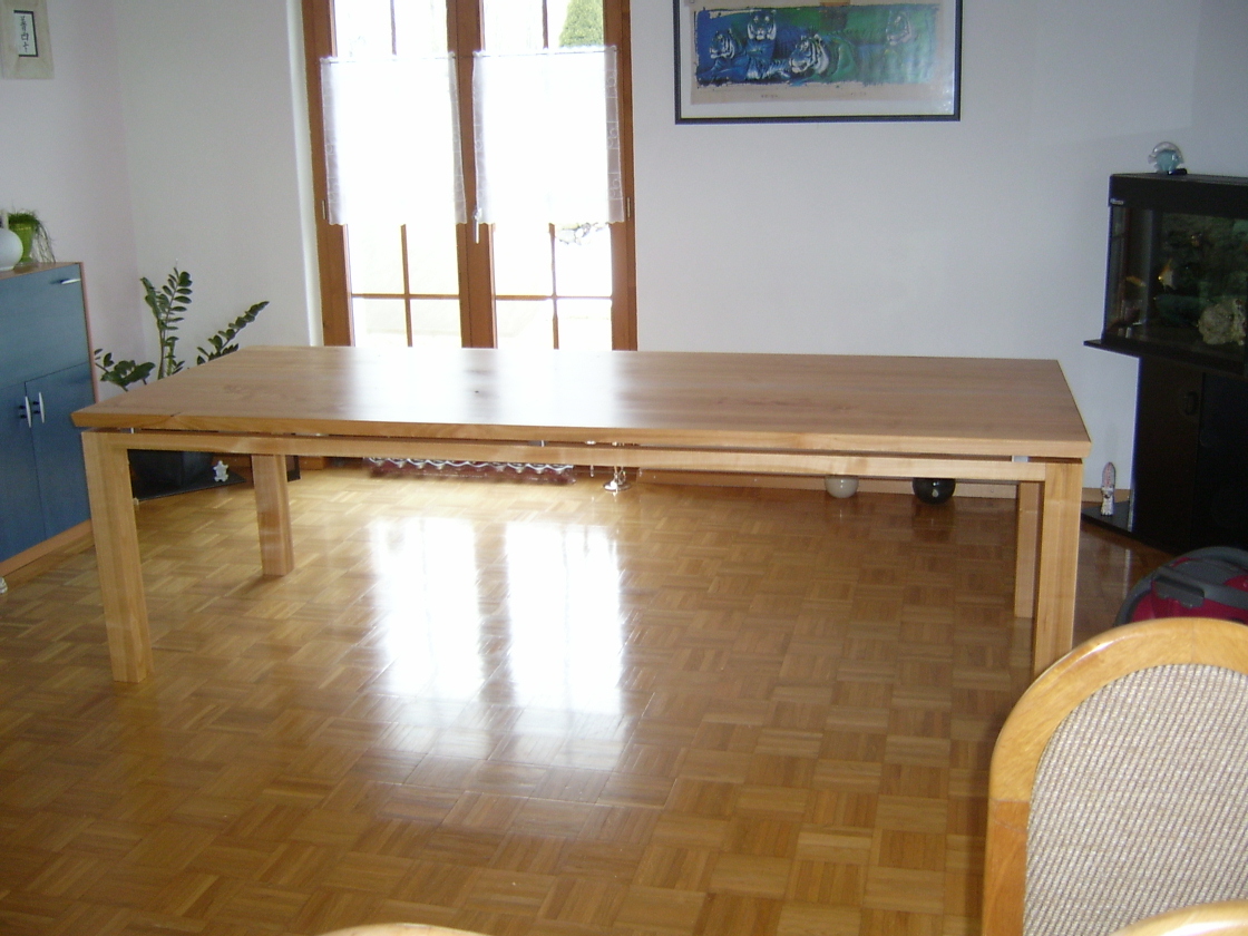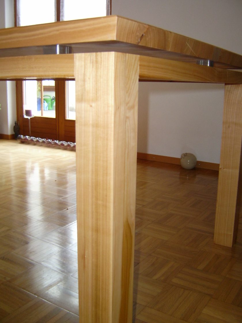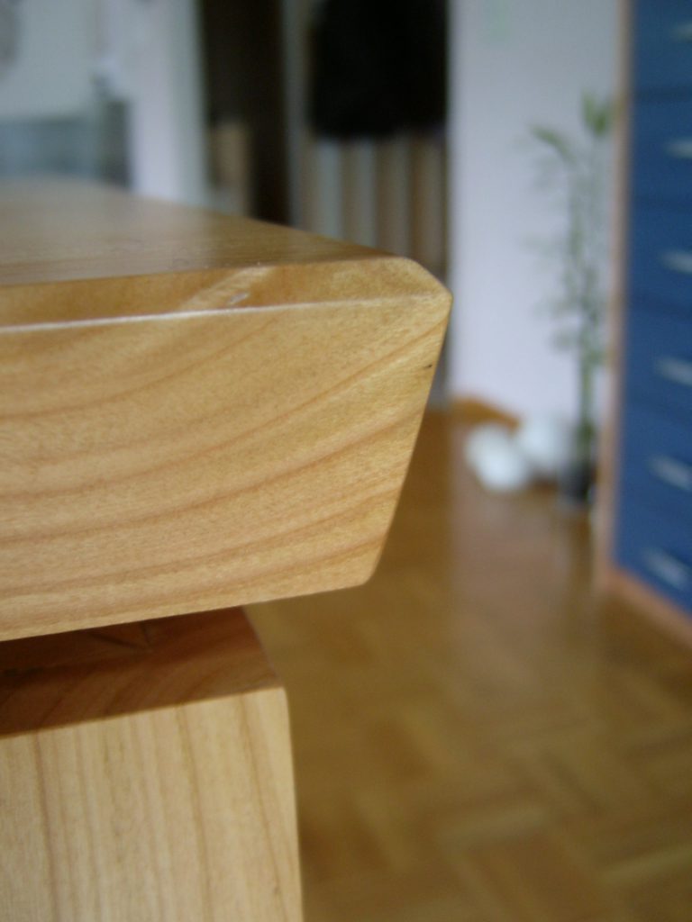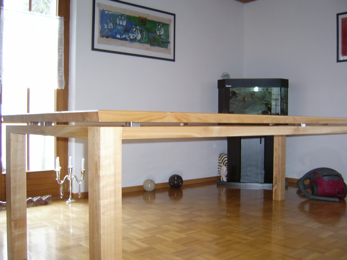 Dieser elegante, in seiner Erscheinung leichte Tisch hat eine besondere Geschichte zu erzählen. Ca. sechs Monate nachs einer Fertigstellung gab es eines Tages einen lauten Knall im Wohnzimmer des Kunden. Das eingelegte, mittige Ahornstück stand unter einer inneren Spannung und gab dieser an besagtem Tag nach…